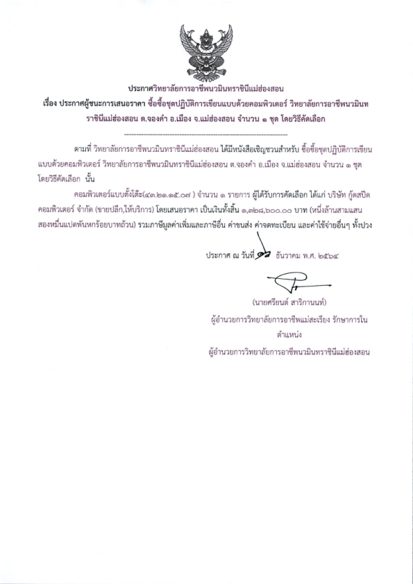 ประกาศผู้ชนะการเสนอราคา ซื้อชุดปฏิบัติการเขียนแบบด้วยคอมพิวเตอร์ จำนวน 1 ชุด